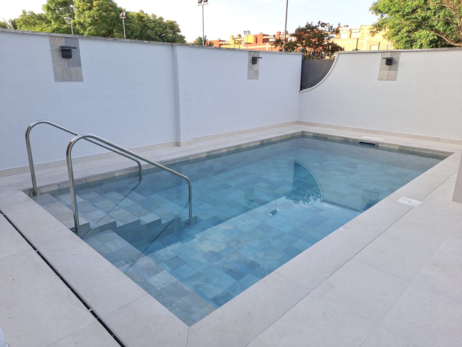 Piscina de obra construida en Jerez de la Frontera, Cádiz con uno dimensión de 6.50 x 3.50 metros aprox. Para acceder al interior de la piscina cuenta con una escalera de obra interior con dos pasamanos ambos lados. Además cuenta con banco interior. Totalmente impermeabilizada con productos de gran calidad. El revestimiento utilizado es material porcelánico. Acabada con bordillo de coronamiento en material porcelánico. Equipada con focos led, skimer y doble pasamanos de acero inox.